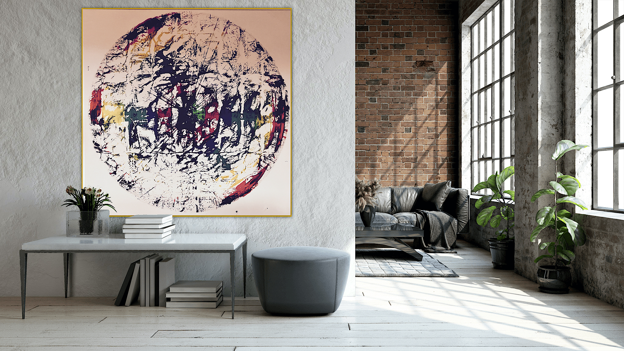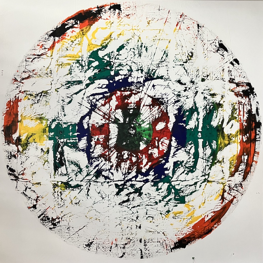 Das Werk zeigt einen abstrakten Kreis, der durch dynamische Farbschichten und brüchige Linien definiert ist. Die zentrale Farbkomposition aus Grün, Rot und Gelb erinnert an ein Ziel oder einen Fokuspunkt, was auf Themen wie Orientierung oder Aufmerksamkeit hinweisen könnte. Die unregelmäßigen Strukturen und Farbspritzer vermitteln Bewegung und Chaos, während die Kreisform einen Sinn für Einheit und Zyklus bewahrt. Die kontrastreichen Farben und Texturen könnten einen Konflikt oder die Verbindung zwischen Ordnung und Unordnung darstellen. Insgesamt wirkt das Bild wie eine metaphorische Darstellung innerer Zustände oder gesellschaftlicher Dynamik.
