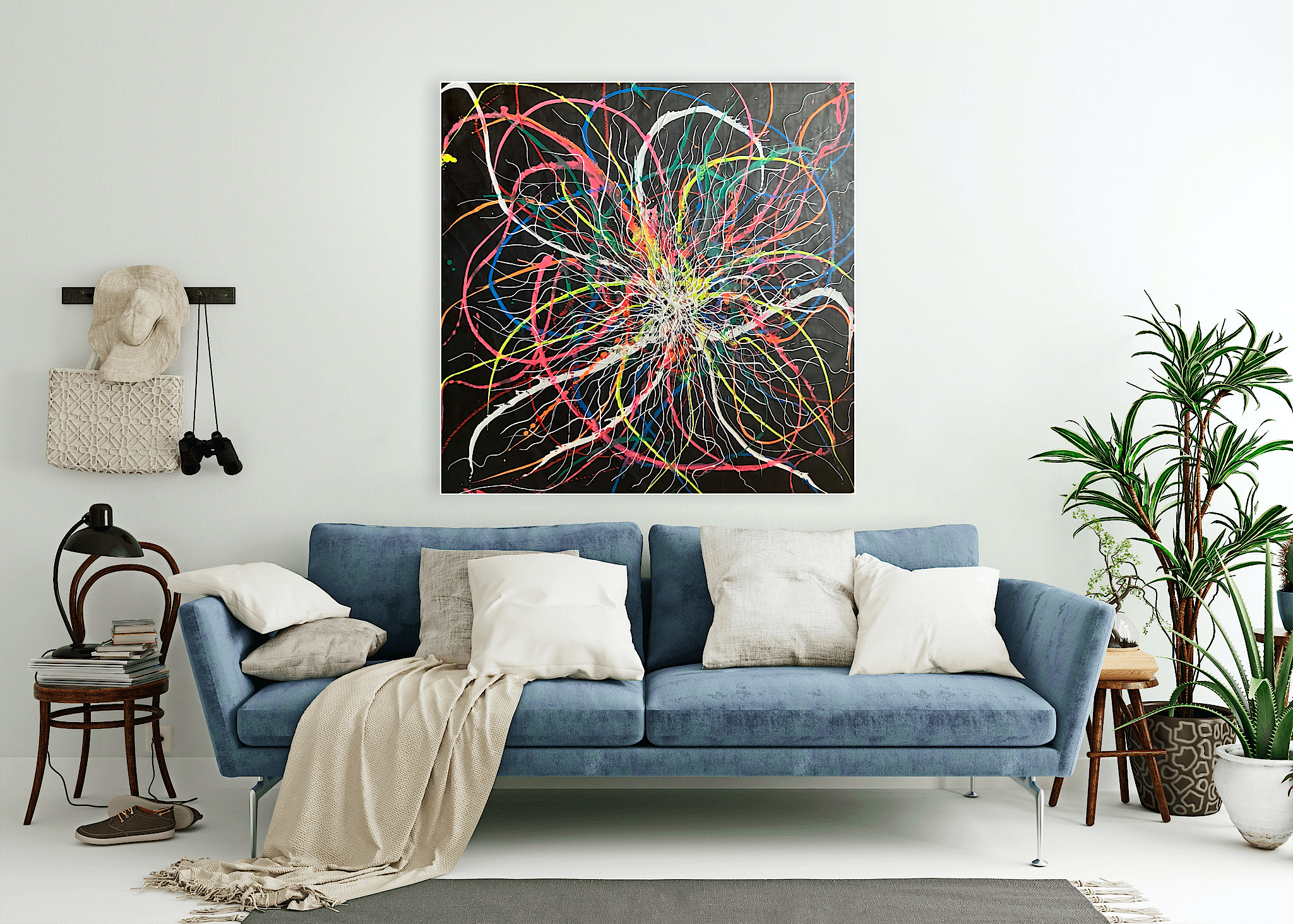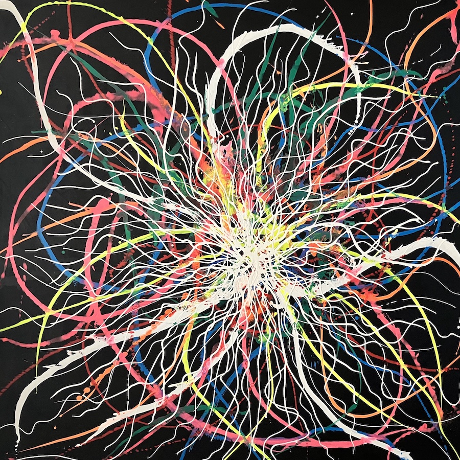 Dieses Werk zeigt ein komplexes Geflecht aus farbigen Linien, die aus einem zentralen Punkt in alle Richtungen strahlen, was an Explosionen oder organische Wachstumsmuster erinnert. Der schwarze Hintergrund lässt die leuchtenden Farben besonders hervortreten und symbolisiert möglicherweise das Unbekannte oder das Universum. Die Linien wirken dynamisch und chaotisch, könnten aber auch Verbindungen, Netzwerke oder Lebensenergie darstellen. Die Balance zwischen Zentrum und Ausbreitung deutet auf Themen wie Ursprung und Evolution hin. Insgesamt vermittelt das Bild den Eindruck von Lebendigkeit, Bewegung und kreativer Kraft.