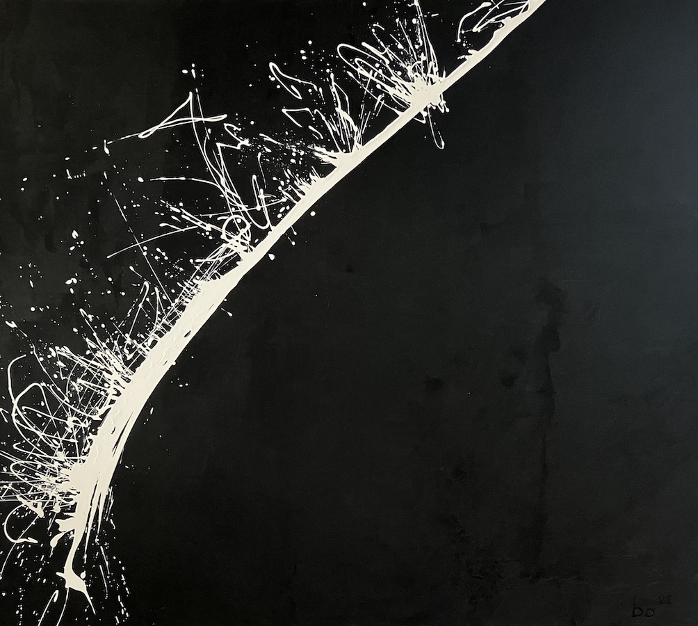 Das Bild zeigt eine abstrakte Komposition mit einem dominanten schwarzen Hintergrund, der durch eine dynamische weiße Linie und Spritzer durchbrochen wird. Die geschwungene, fast explosive Bewegung der Linie wirkt wie eine energetische Grenze oder ein Schnitt durch den Raum. Die weißen Spritzer und Linien, die sich von der Hauptlinie abzweigen, vermitteln Chaos und Bewegung, fast wie Funken oder Lichtstrahlen. Die Dunkelheit des Hintergrunds kontrastiert stark mit der Leuchtkraft des Weiß, wodurch ein Gefühl von Spannung und Dualität entsteht. Es könnte als Darstellung von Energie, Bruch oder Übergang interpretiert werden.